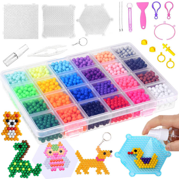 A varázslatos 24 színű vízgyöngykészlet készlet, amellyel gyönyörű képet készíthetsz. A készlet kész mintákat tartalmaz, amelyeknek köszönhetően könnyebb lesz elkezdeni a játékot. Az elrendezett gyöngyöket vízzel permetezheti, és kulcstartót vagy 3D figurát készíthet. Remek szórakozás nem csak kicsiknek. A készlet korlátlan lehetőségeket biztosít számunkra, hogy saját világunkat alkossuk meg, tele élénk színekkel és ötletekkel. Használd a fantáziádat.