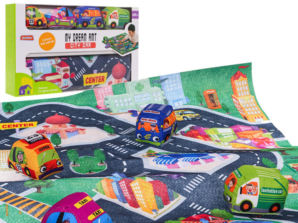 Sokszínű filcszőnyeg városi mintával és 4 puha járművel 6 hónapos kortól gyermekek számára.