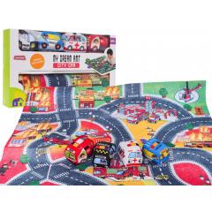 Sokszínű filcszőnyeg tűzoltómintával és   4 puha járművel 6 hónapos kortól gyermekek számára.