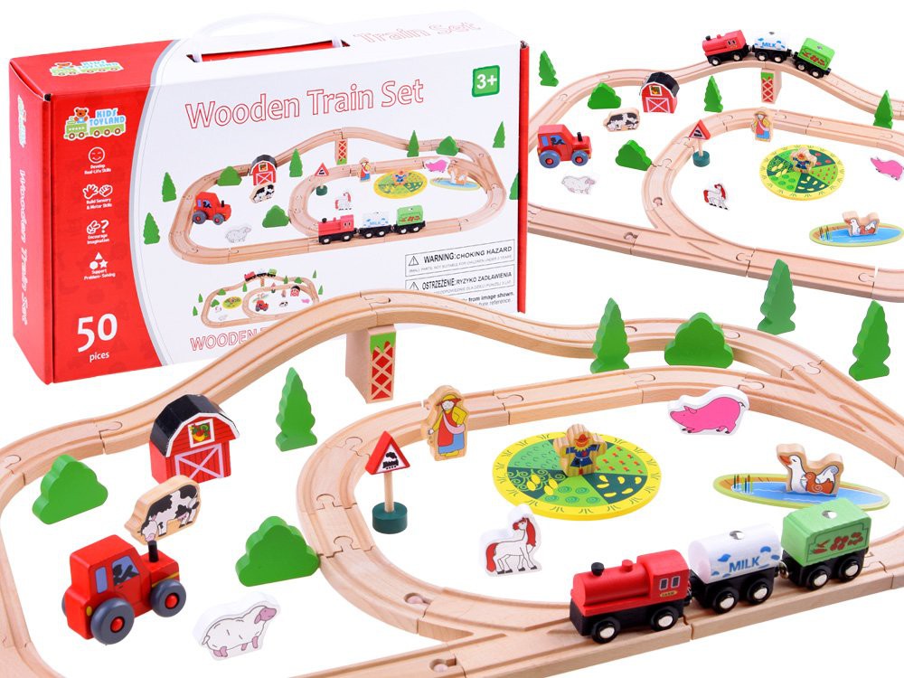 Egy időtlen játék gyerekeknek, egy fából készült vonat állatokkal minden gyermek számára javaslatot tesz. A készlet 50 elemből áll, amelyek felhasználhatók kocsikkal ellátott vonat vágányainak megépítésére. A szett kiváló minőségű fából készült, vonzó színekkel és mintákkal. A fajátékokat biztonságos festék borítja, a pályák természetes színűek.