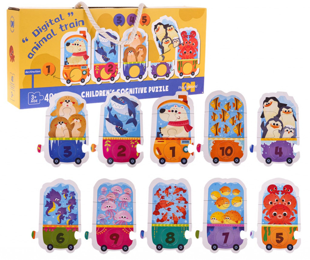 Minden vagonhoz tartozik egy szám és egy kártya a megfelelő számú állattal , ami egyszerűvé és élvezetessé teszi a számolás tanulását . Az élénk színek és a vonzó illusztrációk emellett felkeltik a kíváncsiságot és játékra ösztönöznek.