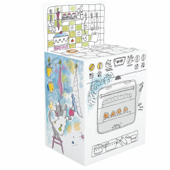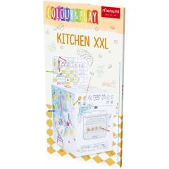 Tartós kartonból készült tágas konyhai kifestőkönyv, fehér kartonnal borítva. Nagyméretű, precízen vágott elemek, könnyen összeszerelhető ragasztó és olló nélkül. Képes útmutató a csomagolás hátoldalán. A mozgatható részek, ablakok, nyitott terek és polcok vonzóbbá teszik a szerkezetet.