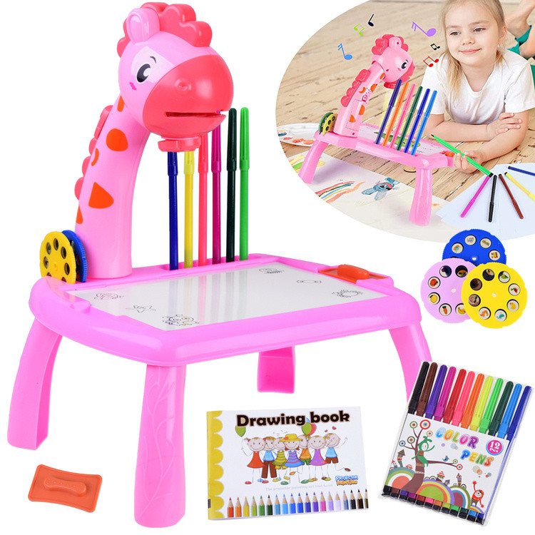 A Zsiráf projektor egy elbűvölő játékkészlet minden olyan gyermek számára, aki szereti a művészetet, rajzolni, festeni, képeket nézegetni és egyedi történeteket alkotni. A zsiráf projektor asztallappal rendelkezik, amelyen a gyermek tollal másolhatja a kivetítőről a megjelenített képeket. Az asztallapot laposan lefektetheti saját íróasztalára vagy négy lábat rögzítheti hozzá, így kis íróasztalt készíthet belőle. A projektor felhasználási területe széles, az adott típusú (állatok, járművek, gyümölcsök) képeket papírra, íróasztalra, de esténként a falra is kihelyezheti. A kivetítő nagyon szépen van elkészítve, és nagyon jó szórakozást fog nyújtani játék közben.