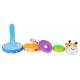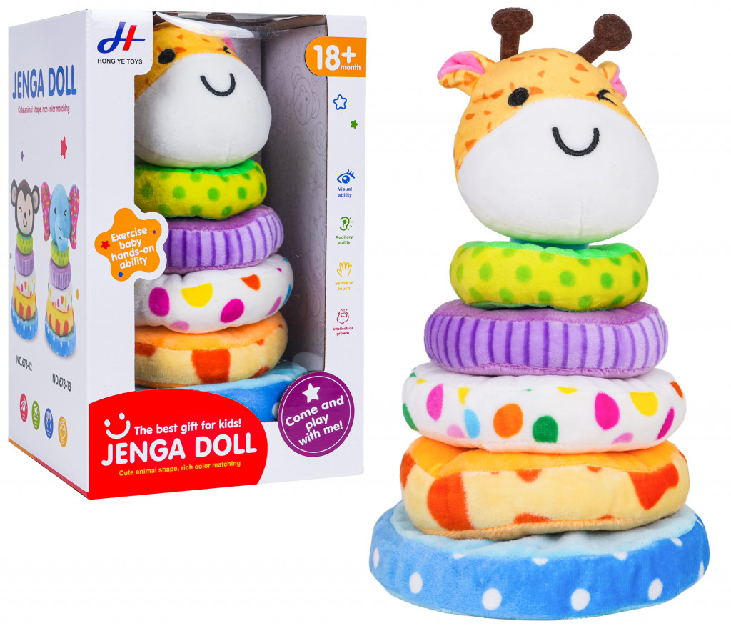 Zsiráf alakú, puha piramis, tizennyolc hónapos kortól gyermekek számára. A plüssből készült játék kellemes tapintású, az anyagok gazdag színei pedig vonzzák a baba figyelmét és játékra ösztönzik. A készlet egy alapból, négy különböző méretű puha gyűrűből és egy zsiráffejből áll. További jellemző a fejben található nyikorgó, amely megnyomásra hangot ad ki. Ez a játék edzi a kis kezeket, és megtanítja őket a formák összehangolására.